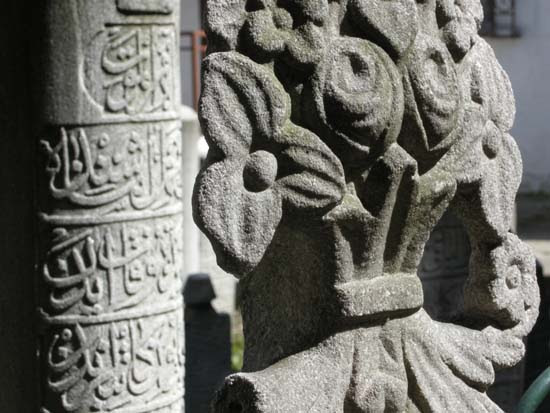 El caso es que llegamos a Üsküdar a mediodía. El viejo cementerio está detrás de la mezquita de Mihrimah, del siglo XVI. Llegamos allá al azar de nuestros pasos, con pocas esperanzas de tener la oportunidad de tomar ninguna foto decente. Pero los marcados relieves y las duras sombras de los postes sobre las tumbas turcas, al igual que las inscripciones de los viejos obeliscos, revivían bajo el fuerte sol.