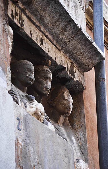 La inscripción de 1468 está enmarcada por dos fragmentos de tumbas antiguas. Una idea algo siniestra para el hombre moderno: ¿quién de nosotros decoraría la fachada de su casa con lápidas de un viejo cementerio? Pero la lápida superior da una lección aún más escabrosa sobre la antropología de la antigua Roma. Según su texto, fue trabajada por el tallador de marfil Publius Clodius Bromius, esclavo liberado de Aulius y su concubina Curiatia Ammia, para la tumba de Hilarium, su delicia. Uno podría pensar que Hilarium era una pequeña hija o allegada, pero no es así. Como Natalie-Christiane Zidek señala en su Delicati et deliciae. Versuch einer Begriffsbestimmung (2012), los delicati y deliciae que a menudo aparecen en lápidas romanas eran niños y niñas esclavos para el placer de sus amos, bien como meras mascotas humanas, sustitutos de los hijos, o como objetos sexuales. Se trababan fuertes lazos emocionales con ellos, y se lloraba su muerte tan amargamente como Lesbia, la amante de Catulo, llloraba la de su gorrión. Entre los esclavos y libertos eran estos los únicos que recibían una lápida con nombre. La lápida con la familia debajo, con el muchacho sosteniendo un pequeño animal doméstico, actúa como si ilustrara esta relación.